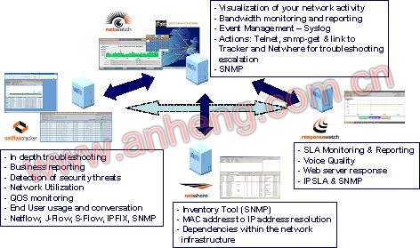 NetFlow Tracker是*个提供有关任意应用程序类型的详细细节信息的强大解决方案,而这些详细信息在以前是很难获得的,使用Cisco's NetFlow技术(这项技术目前已经集成在几乎所有的路由器和第三层交换机的IOS软件中),Tracker可以即时获得所有网络中的流量信息,并提供*个可视化的图形界面来显示收集到的数据,并且它可以显示*小1分钟之内的数据增量情况,它独特的体系结构,如下图所示,允许为准确的诊断提供强大的监控功能,同时为趋势分析以及商业视图提供历史报告功能。